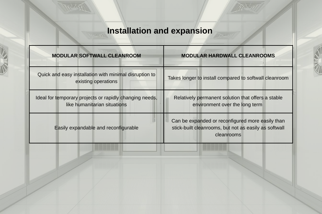 - Ease of cleaning. Compared to modular softwall cleanrooms, their hardwall counterparts are easier to clean because of their smooth, hard, and non-porous surfaces, which can be quickly and easily sanitised.