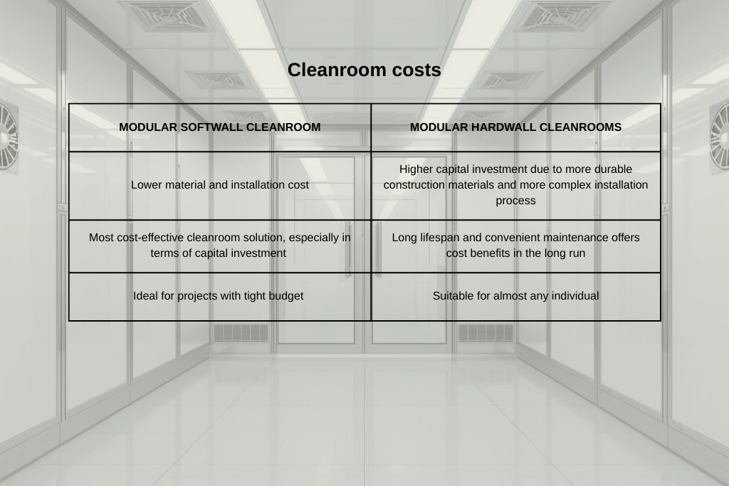 - Budget. Your budget will place constraints on what type of infrastructure you can invest in. Analyse your budget for both your capital investment and operating costs. While softwall cleanrooms are more affordable upfront, hardwall cleanrooms may offer better long-term value.